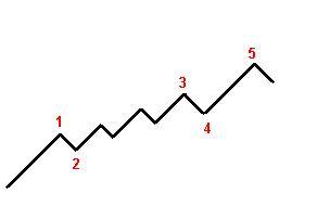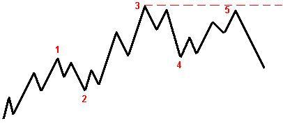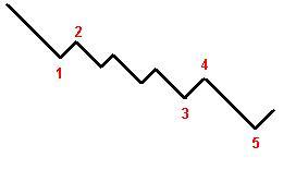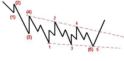 Такая конфигурация появляется на пятой заключительной волне и является моделью "восходящий клин", который всегда является медвежьим. Модель имеет 5 волн, каждая из которых делится на 3 волны. Линии тренда всегда сходятся. Прорыв более крутой является сигналом о значительном повороте рынка. Нисходящий клин