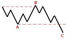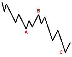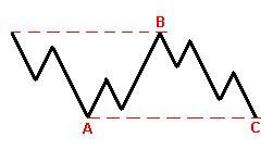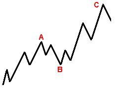 Вершина волны (В) превышает верх волны (А), а волна (С) опускается ниже основания волны (А) для бычьего рынка, и, наоборот, для медвежьего. "Перевернутая неправильная" коррекция