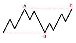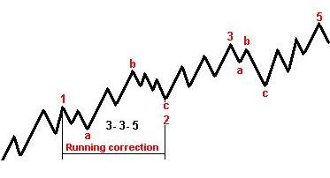 Волна (В) достигает вершины волны (А), в то время как волна (С) так и не опускается до уровня основания волны (А). В этом случае бычий рынок обладает более высоким потенциалом, и, наоборот, для медвежьего рынка. Бегущая коррекция (running correction)