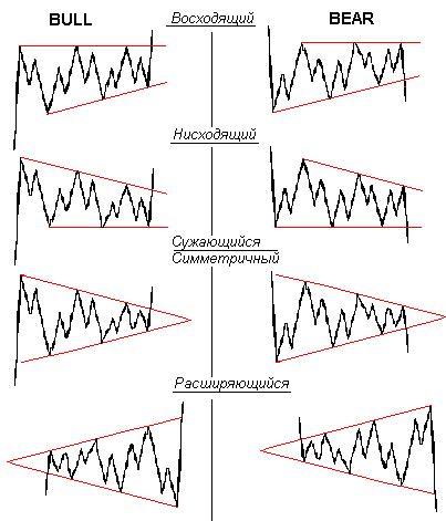 Встречается крайне редко, но появление ее на графиках свидетельствует об очень сильном потенциале рынка. Треугольники Обычно появляются на (4) волне. Они также могут появиться на волне (В), входящую в корректирующую конфигурацию (А) (В) (С). Таким образом, при восходящей тенденции их можно охарактеризовать как бычью, так и медвежью модель одновременно. Обычно это фигура продолжения, если это не вершина. Как правило, является продолжением существующей тенденции после еще одной волны роста.